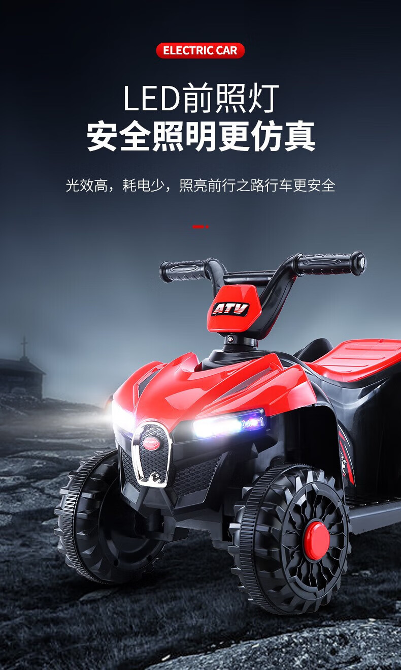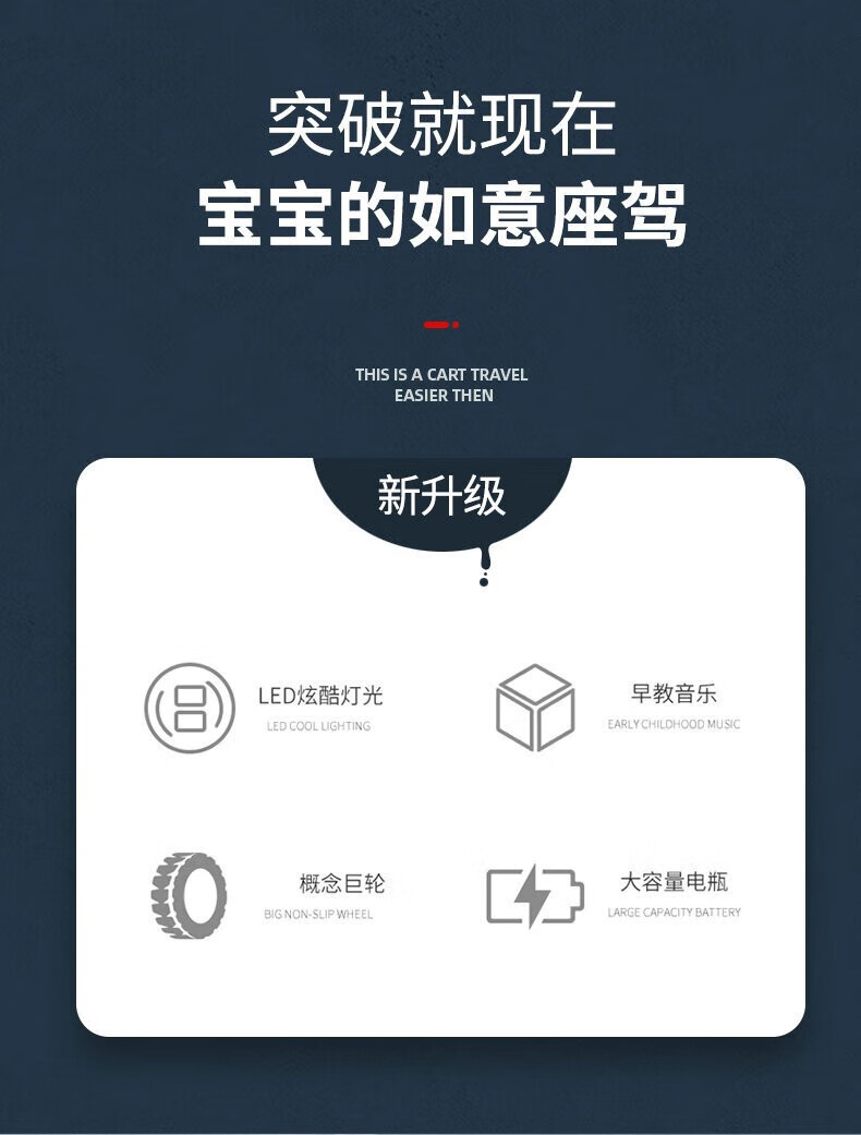 防滑車輪,音樂燈光,加大車身,升級加大電瓶,續航更持久,靈活車把,強勁電機,強勃驅動動力低噪音、強勁、穩定,使用壽命長,環保材質,安全承重,平穩防側翻,無遙控