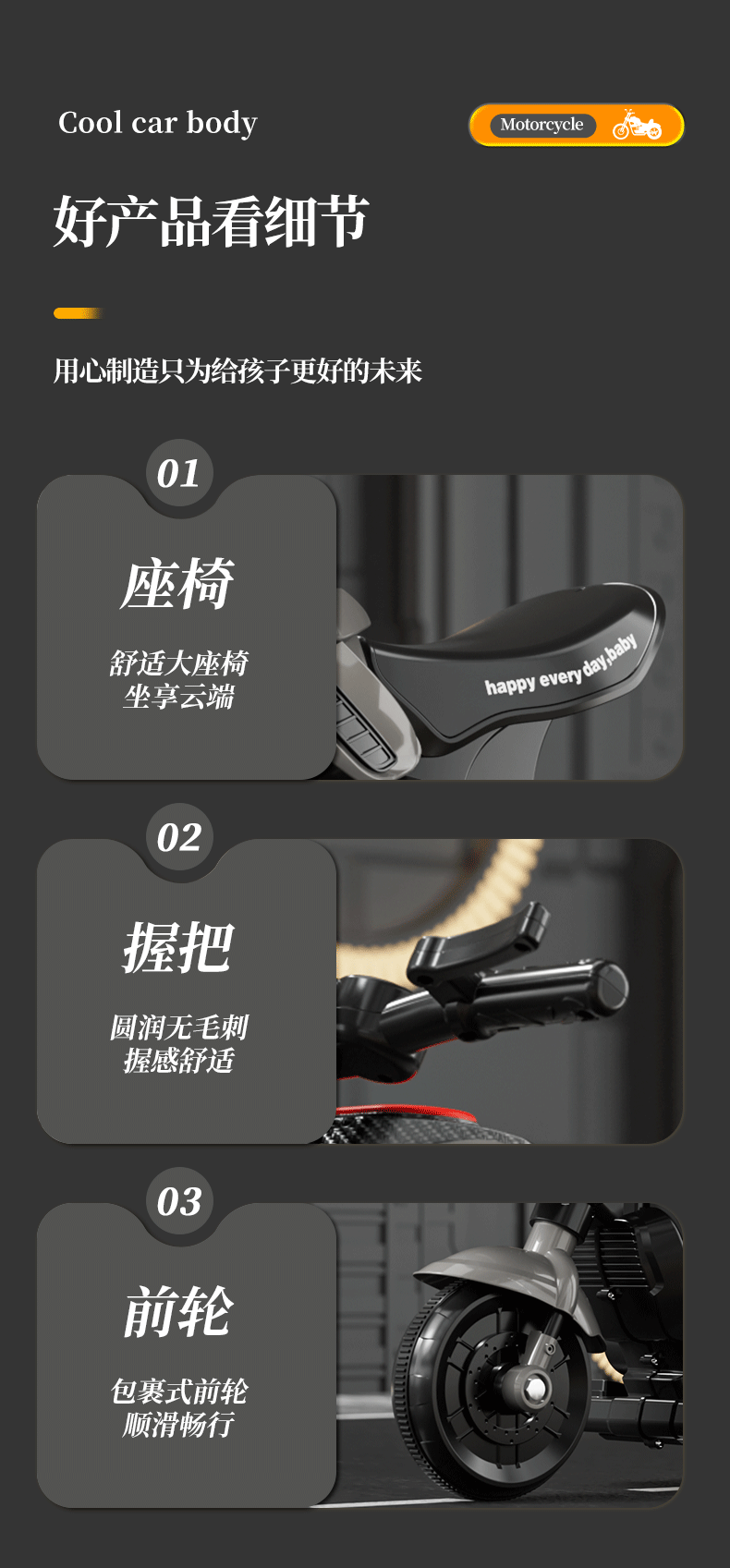 內置多首兒童歌曲、人性化舒適座椅設計,加寬加大,有效增加寶寶的舒適感,內置燈光音樂讓寶寶童趣無限,快樂成長,方向盤環保材質制作,邊緣設計,保護寶寶嫩嫩的小手不受傷害,防滑靜音輪,適合各種不同路況